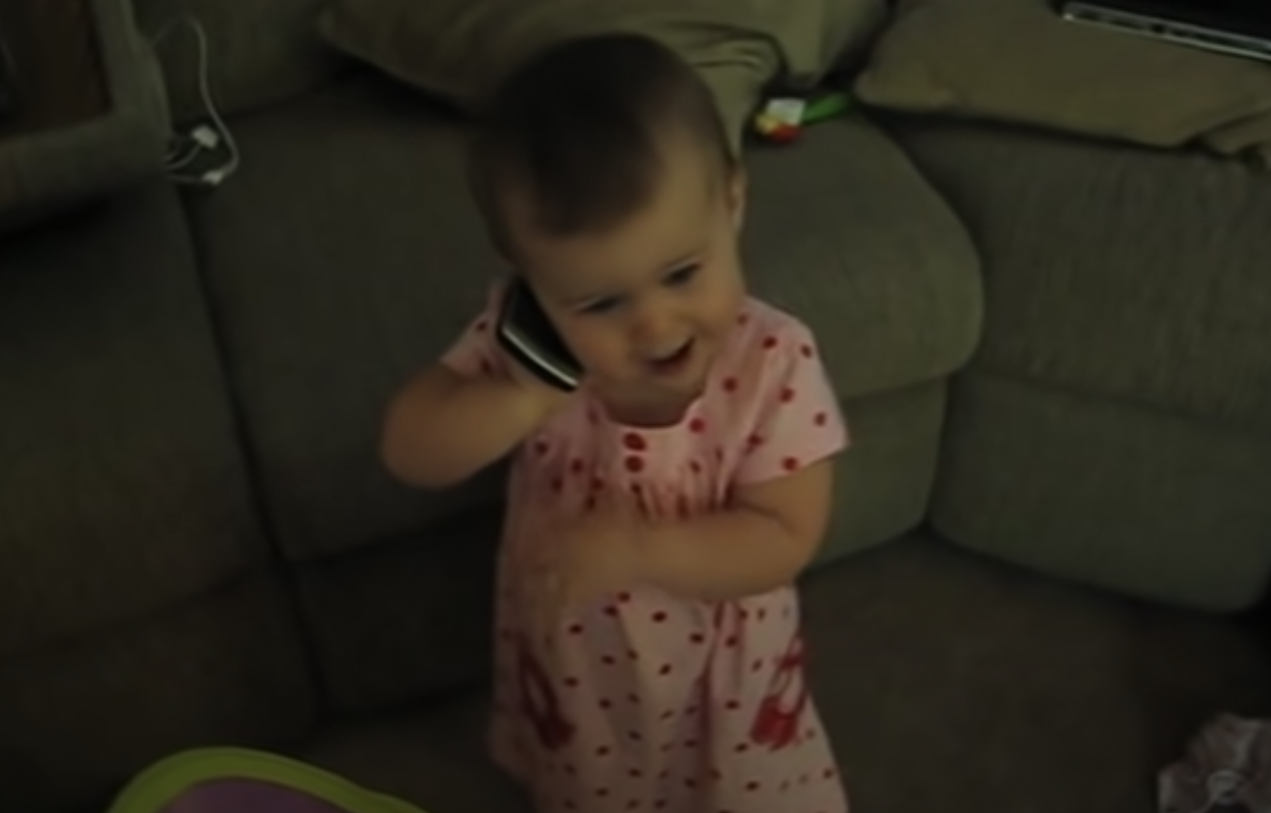 This little girl is so cute in her pink polka dot dress, but what makes her even cuter is that she holds the cell phone like a grown up and walks around the room like an adult. Clearly, she has seen her mom do this many times.