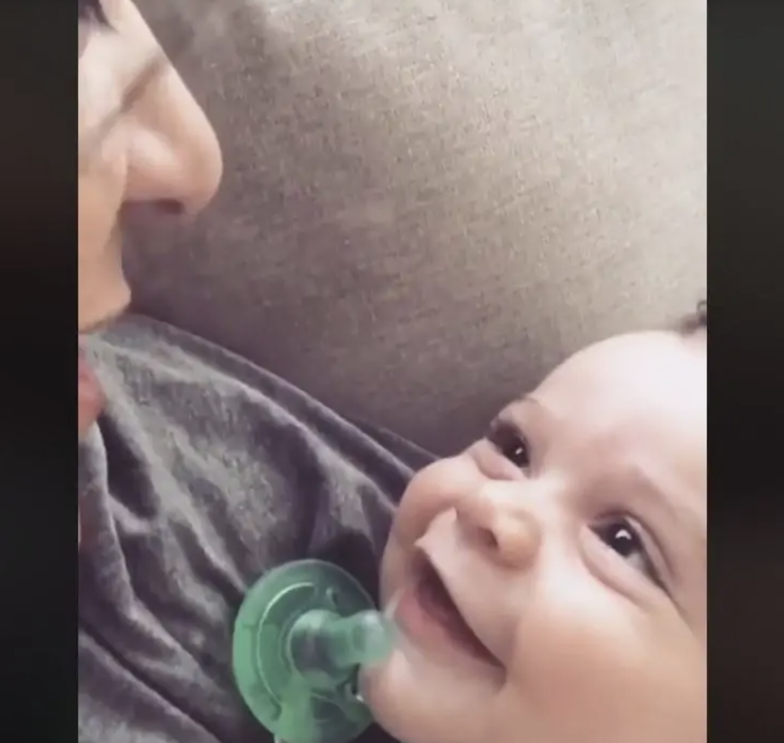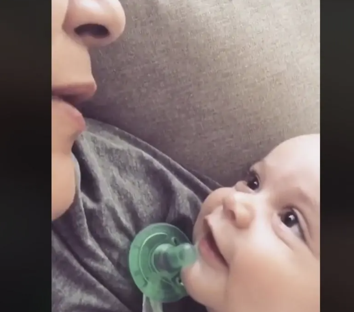 The sweet boy looks up at his mom and smiles while she sings. It’s apparent he’s enjoying listening to her soothing voice and tune.