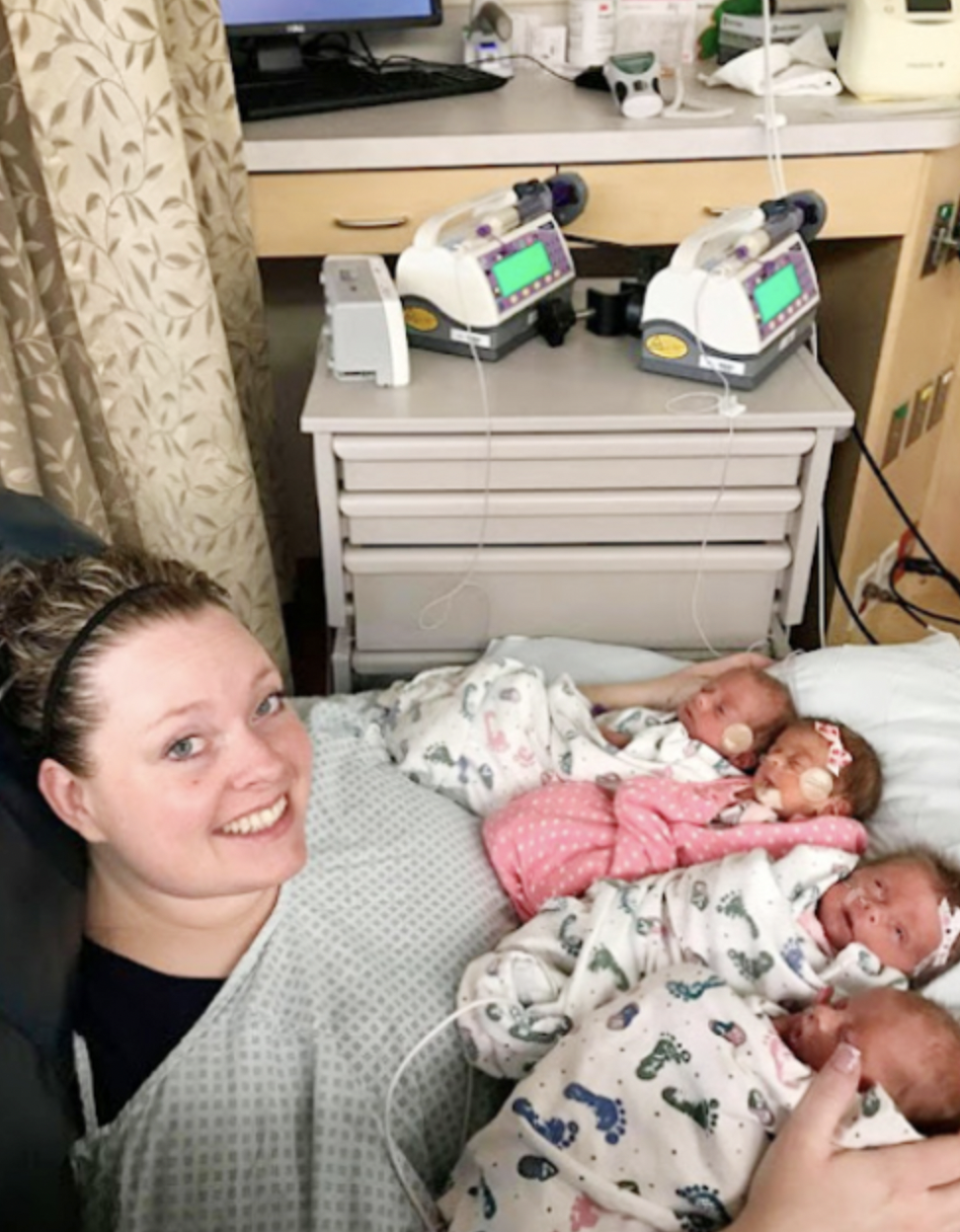 “We just couldn’t believe it when I went for a sᴄᴀɴ and the doctor told me that I was pregnant with quads. We had been trying for so many years to fall pregnant naturally and to discover I was going to have four babies, especially when I’m a ᴛʀɪᴘʟᴇᴛ myself, was just unbelievable. We were very nervous as we knew how ʀɪsᴋʏ a quad pregnancy can be, but luckily all the babies were born safely.”, she said.