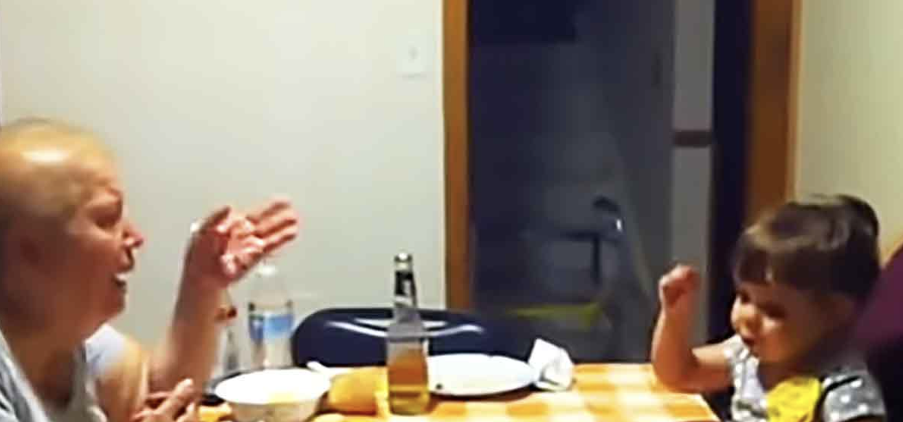 At the beginning, the older woman speaks while clapping her hands, then starts motioning up and down. The little girl mimics her not long after, clapping away while speaking in gibberish.