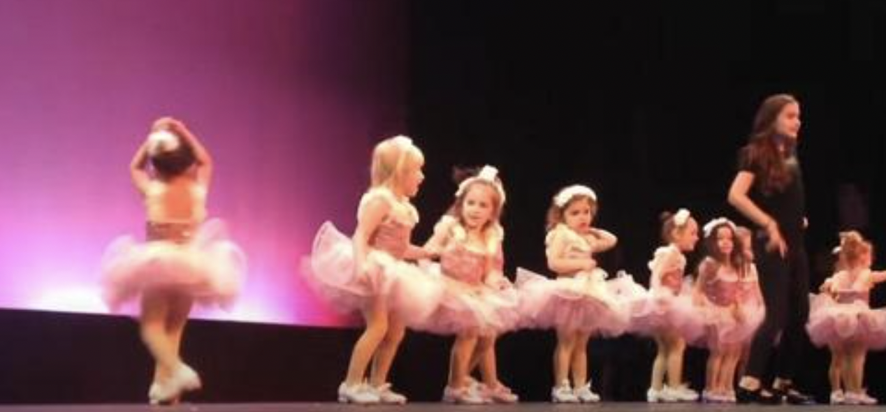 The little girl is standing far away from the rest of the group and looks utterly disinterested. The dancer standing next to her glances over, giving her looks of uncertainty.