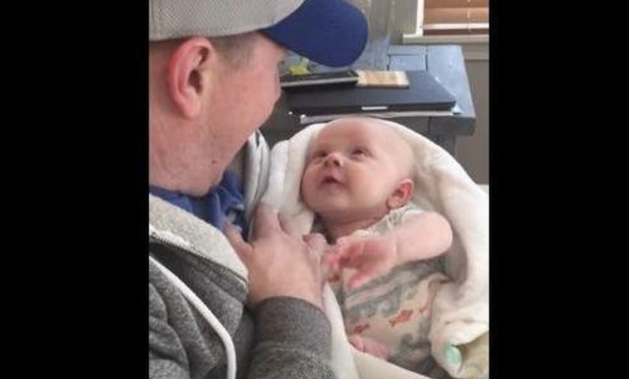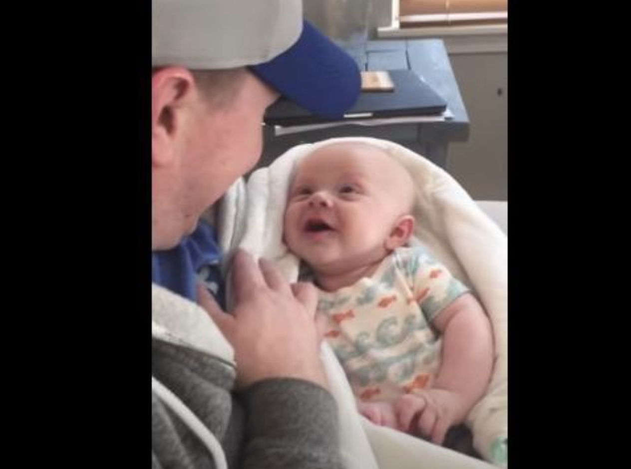 In the video, shared by Jackie Spencer in 2016, a new father is locked in deep conversation with his four-month-old baby. He is sitting on a couch holding the child. They are both snuggled in and ready for some bonding time, and this is when the father decides to have a long conversation with his new child. The baby is gazing up at his daddy with such soft eyes and a warm smile.