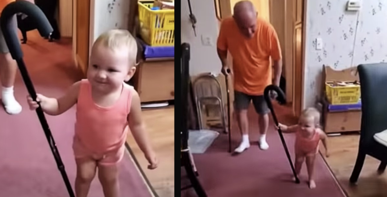But clearly, this sweet child has picked up on more than just grandpa’s cane. As she grins from ear-to-ear, a family member tells her, “Do it, walk like G’pa.”
