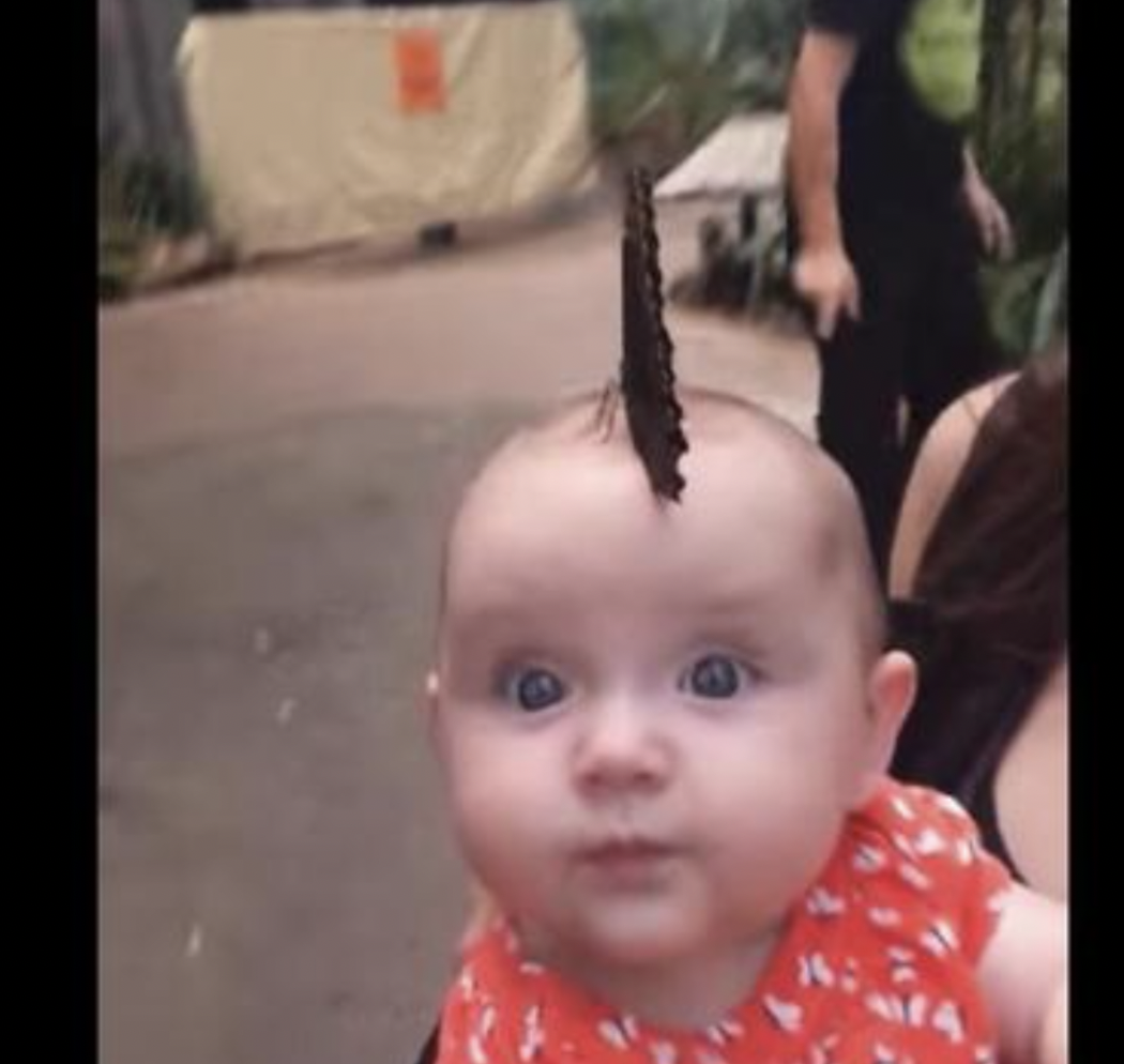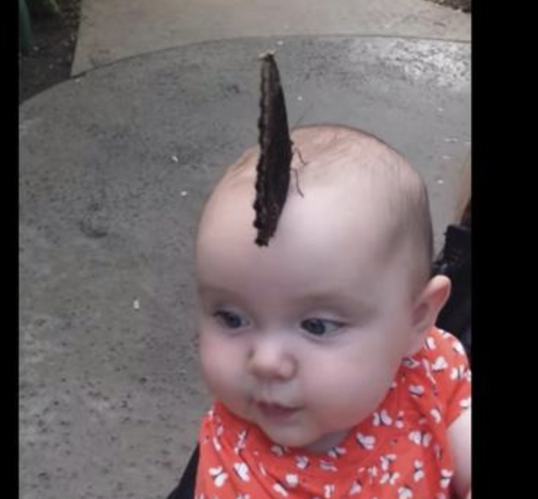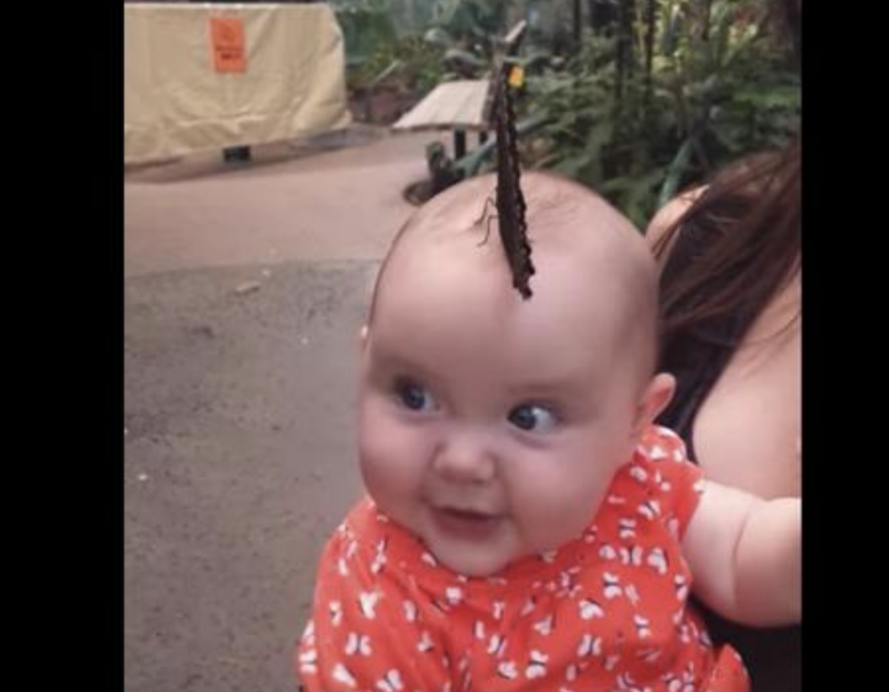 A butterfly passing through at the zoo needed to rest their wings. They found the ideal perching spot on the soft head of a baby.