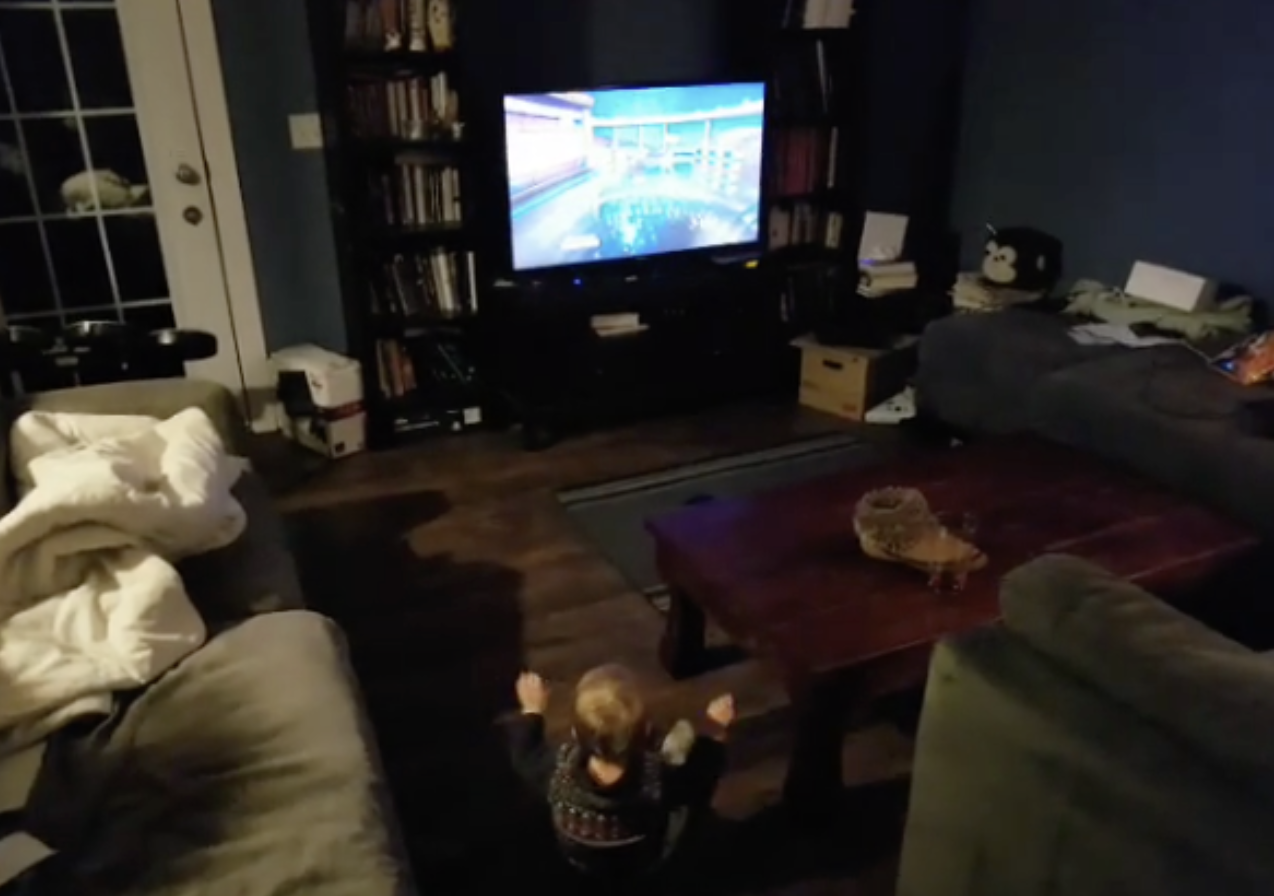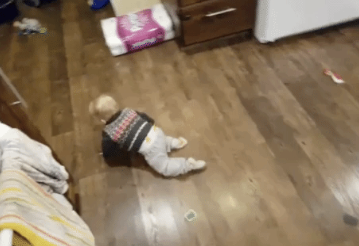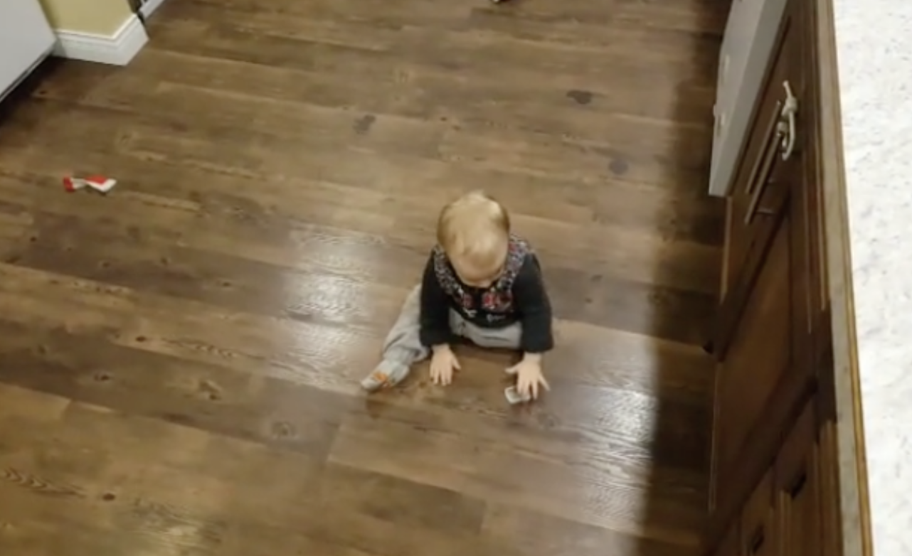The camera quickly shifts back to the tot, but at this point, he’s hustled his way from the kitchen floor and into the TV room to catch his favorite show. To say he was crawling would be an understatement because he makes it into the living room in 10 seconds flat! He slides into his ideal TV-viewing position like a baseball player bringing it in to home plate.