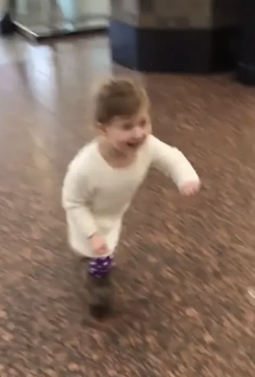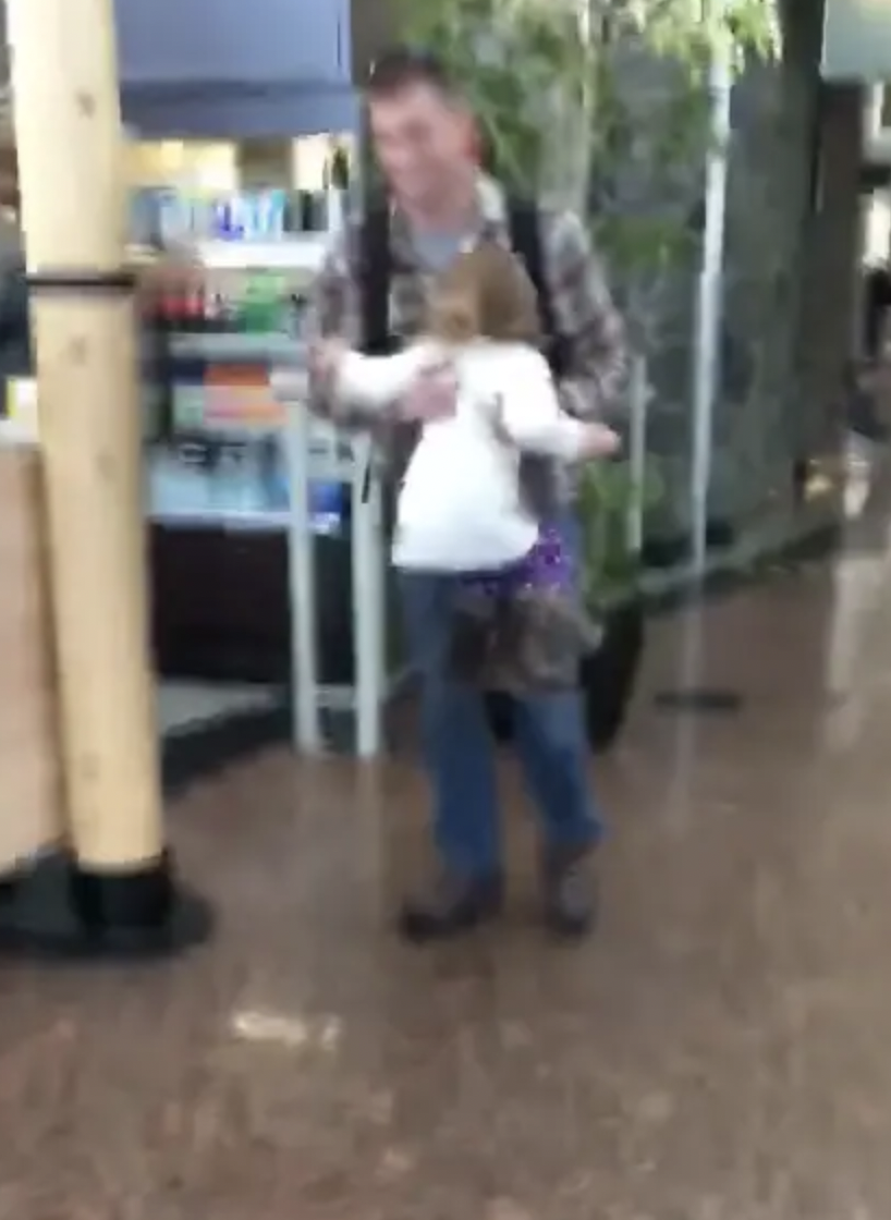 Then the mom told her to look down the hallway. Her dad turned around the corner. Carlin screamed out loud and ran right up to him.