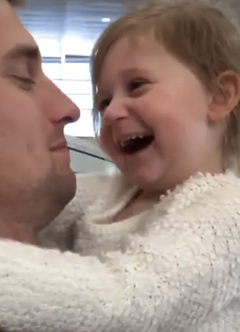 The dad kept on kissing Carlin, and the girl started laughing. Then the dad asked if she was happy to see him. But the answer was already obvious!