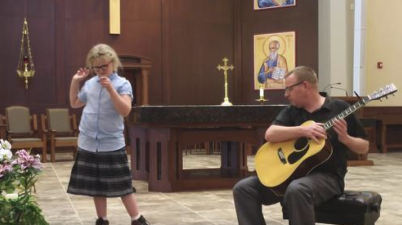 At first glance, this girl seems like a typical first grader. The lightly tousled hair, bright eyes, and a wide smile typical of a seven-year-old greet you as you look in her direction. She even plays with the plants as she walks toward the waiting guitarist. As she settles in to sing, she could be a child singing in any church. She could easily be one of your children, grandchildren, or neighbors.