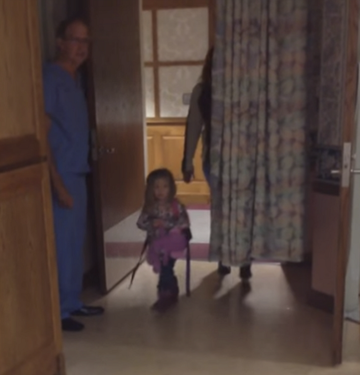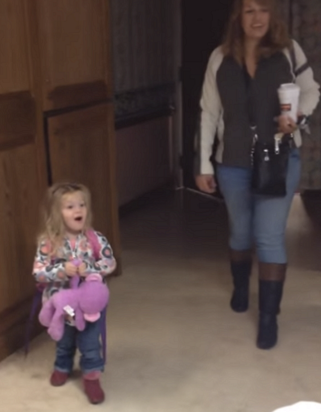 As everyone in the room starts chuckling, the mommy tells her to come closer and see what she is holding in her arms. Then they ask her whether she knows who that tiny human is and as the little girls takes a look at the newborn baby she is over the moon and shouts: