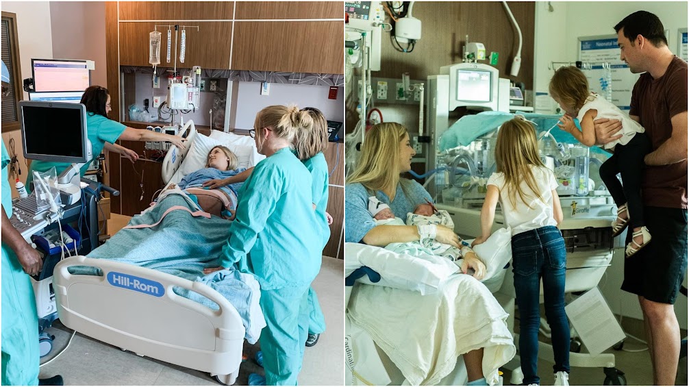 Everything went so smooth. Everyone was so excited to be there with us which really helped calmed my nerves! We had almost 20 people in the operating room. Three doctors, nurses, Anesthesiologist, and a NICU crew for each of the babies. I remember the anesthesiologist being so sweet to me the whole time. He kept holding my hand and talking me through everything. Evan was popping back and forth from my side to the doctors’ side to where each of the babies were getting oxygen levels checked. Eli came head down, followed by Easton who was born in the sac, and Jade born feet first! Evan got the entire thing on video and it’s the coolest thing. We have decided to save that just for us for now but we are sharing a small snip of it here!