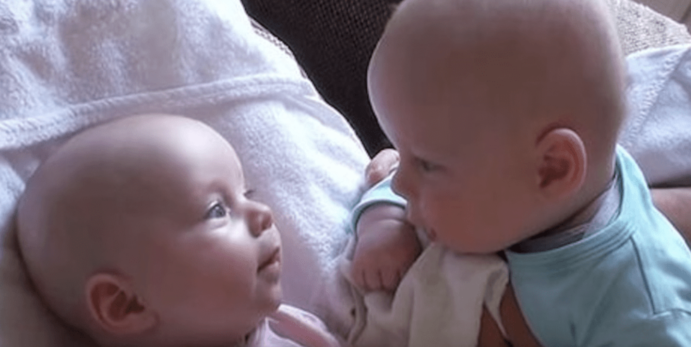 In the video below, you’ll see the most adorable twins sitting opposite one another. With the one dressed in pink and the other in blue, these two have the most intense conversation using their specialized baby talk. They laugh, they listen intently, and they even speak in unison when it counts. One can only imagine all of the interesting stories that these two infants are telling!