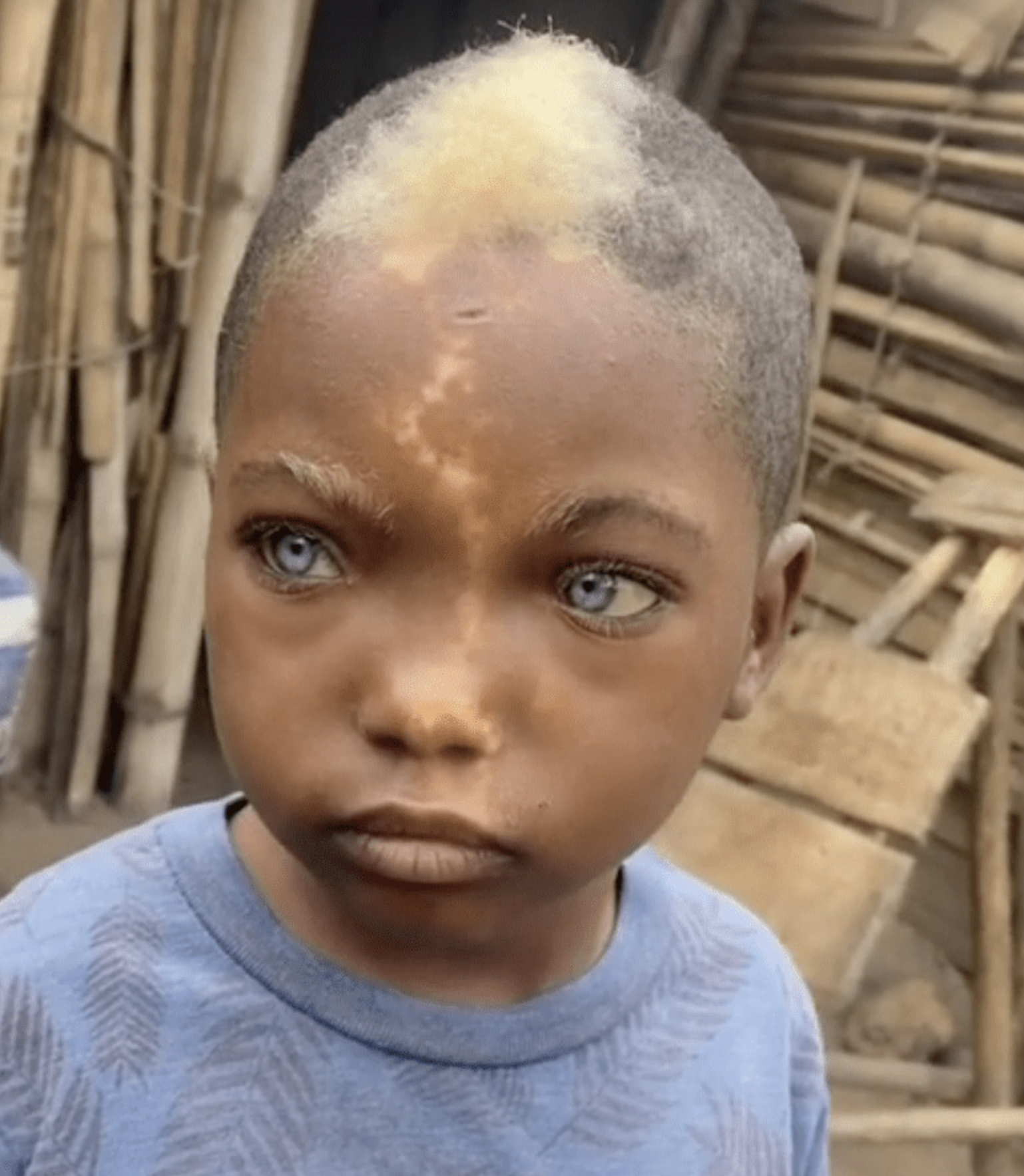 He also has a patch of white hair at the front of his head which seemingly spreads to his face a lightning-like scar that makes him look otherworldly or as some commenters think “an angel.”The first video of the child features him staring into the camera and looking about as he is being filmed. The second video shows the child staring into the camera as he eats from a spoon.The person who posted this video is named Raoul Tsasa and from his description, he is from the Netherlands.